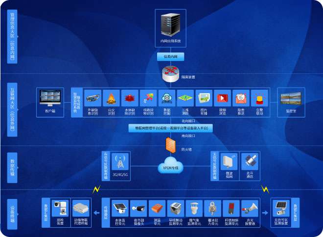 输电线路感知层数据经VPN专网将数据经外网防火墙传输至“物联网管理平台”或“统一视频平台”等设备接入平台。通过北向接口调取设备接入平台数据进行应用展示,并可通过隔离装置将实时图片传入信息内网,同时传递图像抓拍指令。